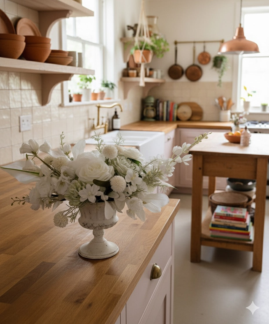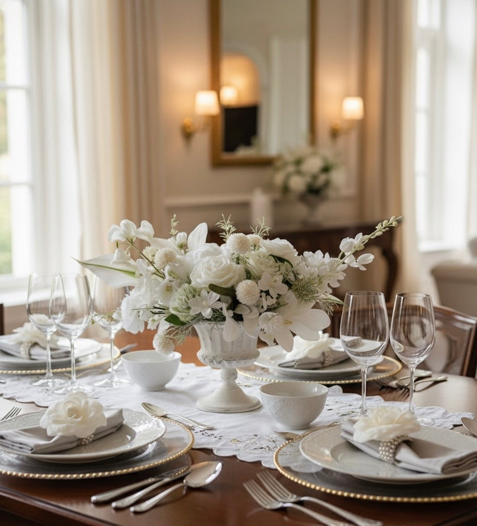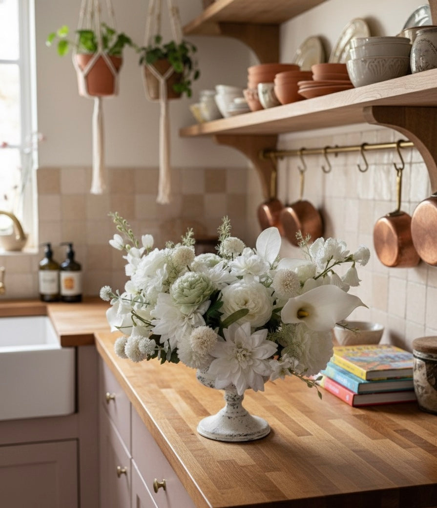 An elegant white artificial flower arrangement in a classic decorative vase — perfect for adding a soft, timeless touch to your space. Handcrafted in light, neutral tones, this piece is ideal for table settings, photo backdrops, or everyday home décor.