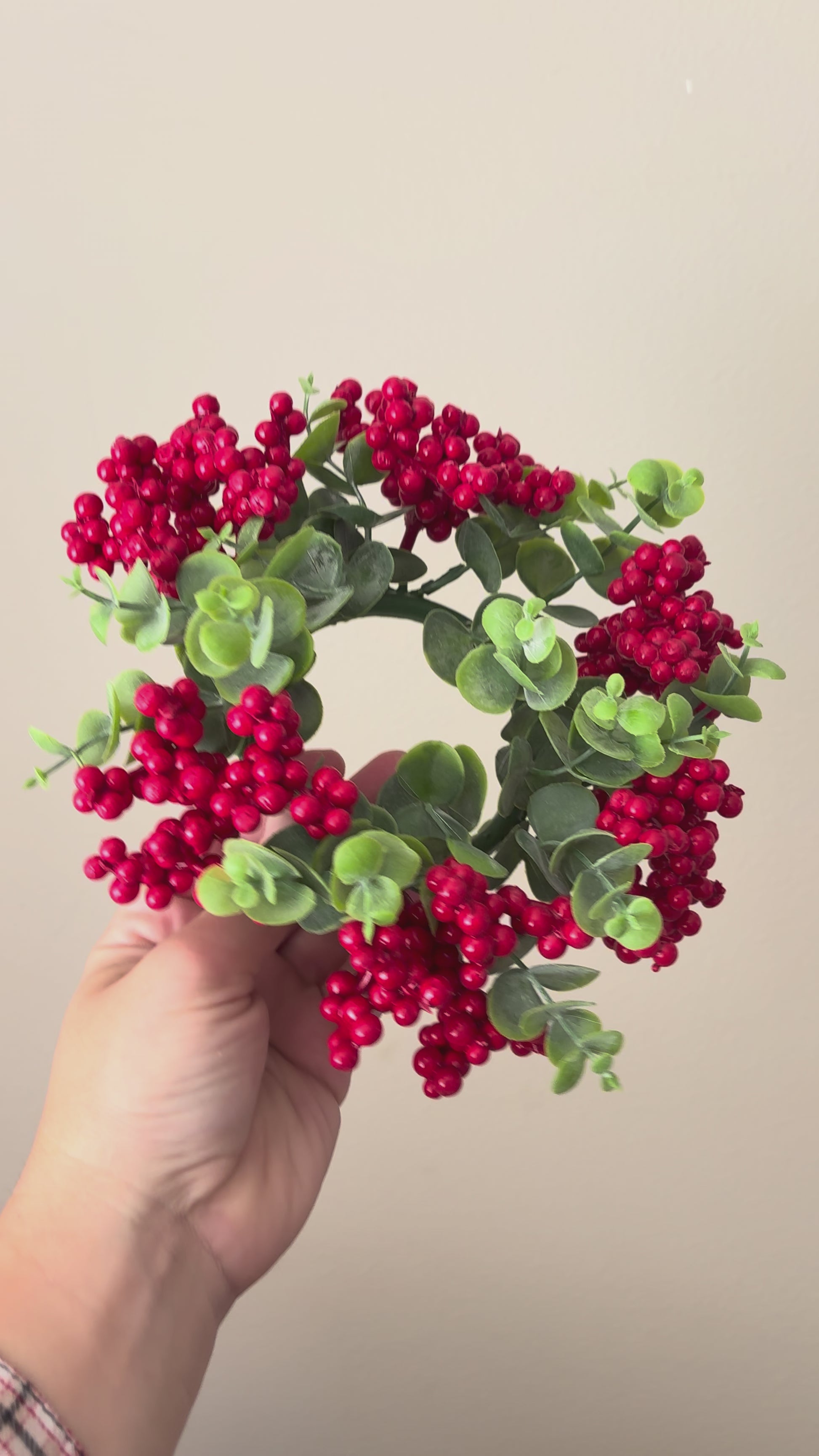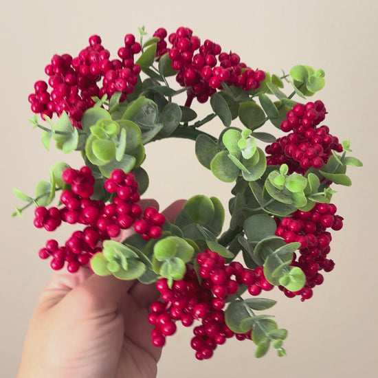Create a cozy, festive atmosphere with this decorative candle ring wreath, perfect for dressing up any candlestick. The wreath combines matte green eucalyptus leaves and rich red berries, adding a touch of classic Christmas charm.