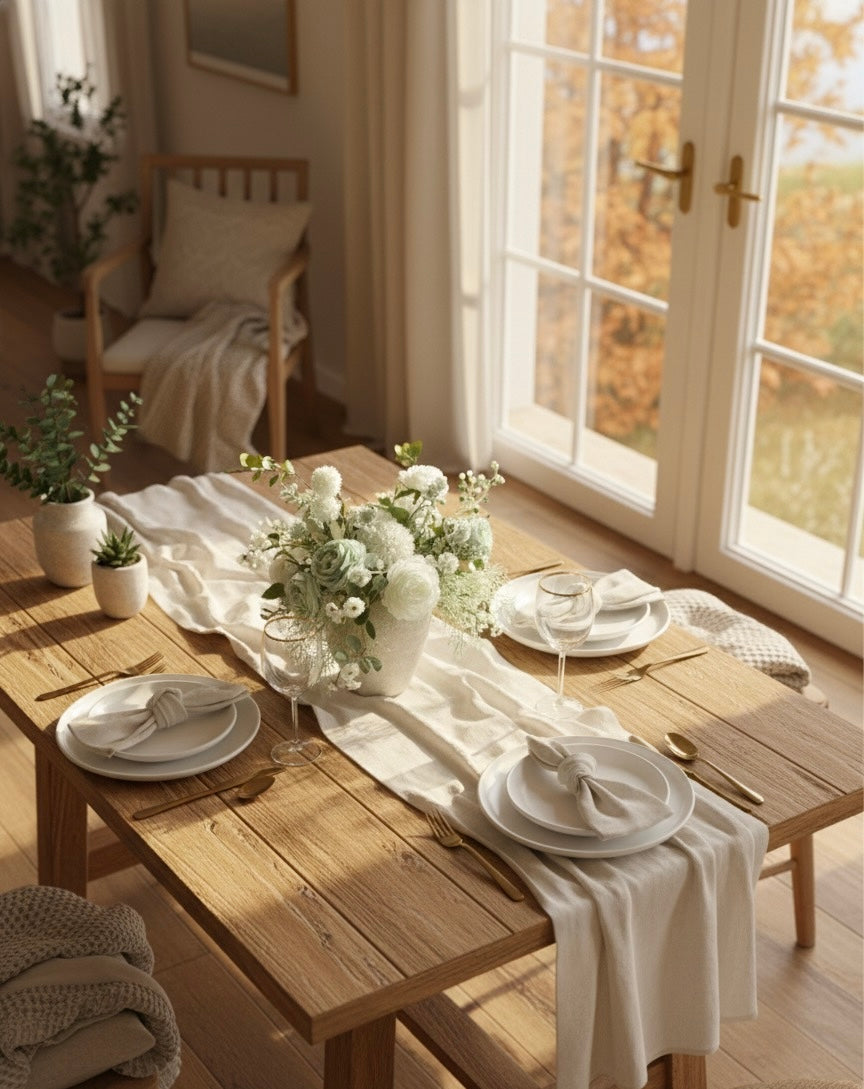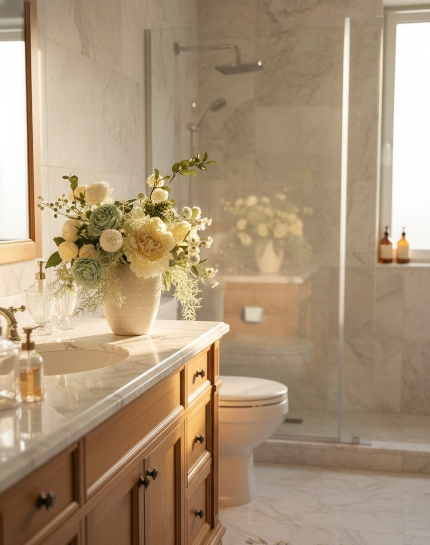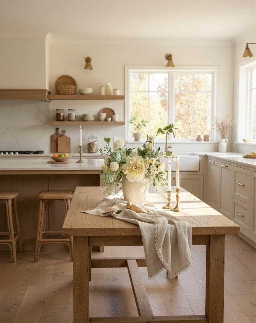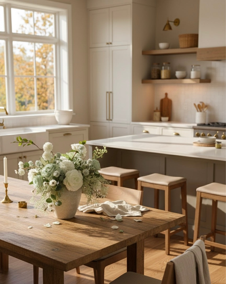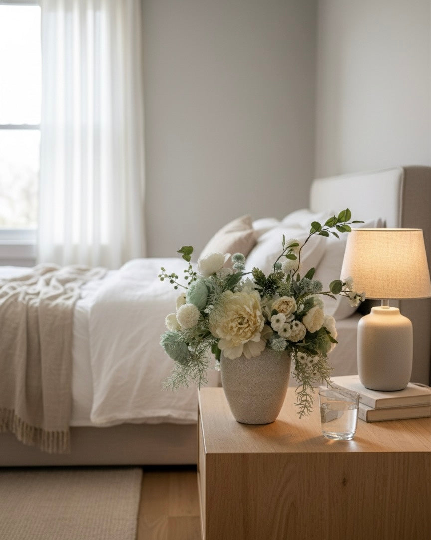 This Luxury Faux Floral Arrangement is the perfect centerpiece to create an atmosphere of elegant farmhouse or modern rustic chic. It blends large cream peonies, delicate roses, and unique mint green and white foliage in a textured beige ceramic vase. Ideal for a kitchen island, dining table, or bathroom vanity.